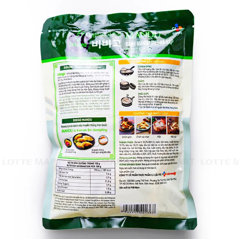 Đặc điểm nổi bật: Sản phẩm là một sự kết hợp đặc biệt giữa vị ngọt thơm của thịt và độ dai giòn của bắp, chỉ cần cắn nhẹ một cái là bạn sẽ cảm nhận được ngay sự hấp dẫn của lớp nhân đặc biệt này. Bánh được làm theo công thức truyền thống của Hàn Quốc, được đóng gói sẵn tiện lợi, thích hợp cho người bận rộn. Là món bánh truyền thống của Hàn Quốc với lớp vỏ mỏng, gợn sóng đẹp mắt bên ngoài, cùng nhân thịt và bắp ngọt thanh, tươi ngon, đậm đà bên trong. Bánh có thể chế biến theo nhiều cách khác nhau tùy theo khẩu vị.
