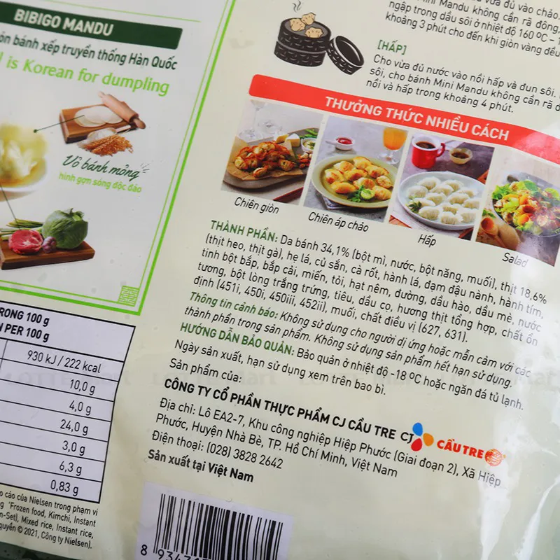 Thành phần: Thịt heo 38.7%, bột mì, nước, hẹ lá, củ sắn, tinh bột bắp, hành tím, cà rốt, bột năng, tỏi, hạt nêm, đường cát, dầu hào, nước tương, bột lòng trắng trứng, muối, tiêu, dầu cọ, chất điều vị,...