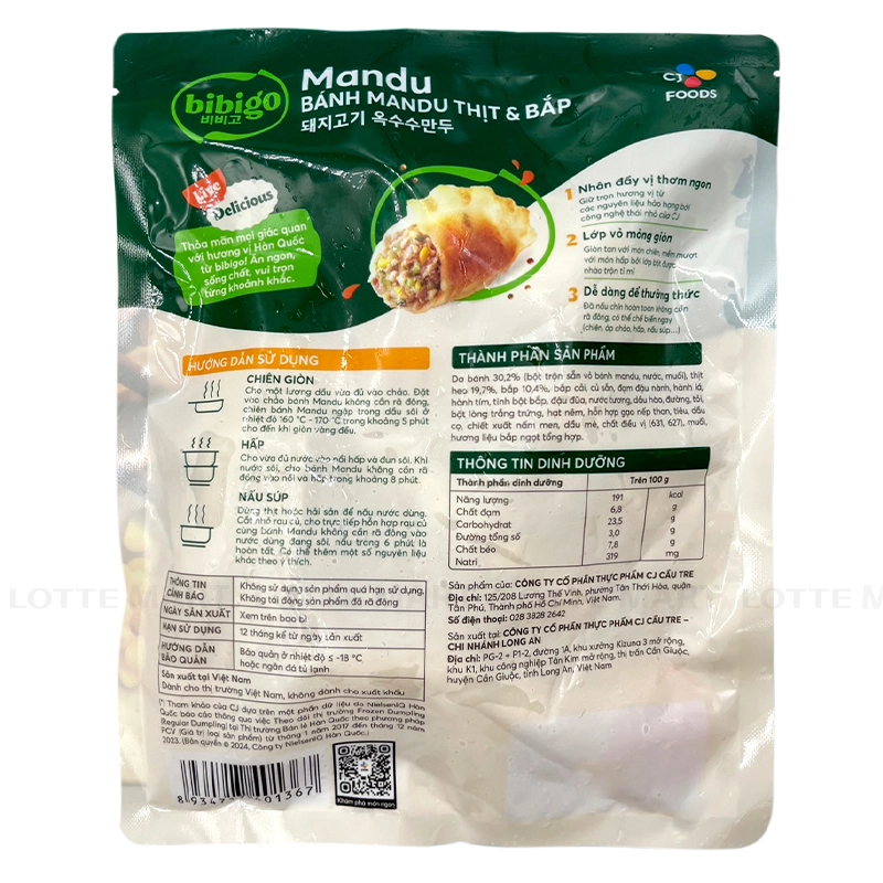 - Bánh Xếp bibigo Nhân Thịt Và Bắp có lớp vỏ mỏng giòn hình vỏ sò uốn lượn đẹp mắt, nhân bánh đầy, vị bánh thơm ngon.