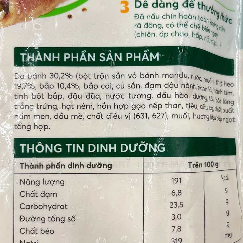- Thịt heo 26.8%, bột mì, củ sắn, bắp 8.8%, nước, đạm đậu nành, bắp cải, tinh bột bắp, hành tím, hành lá, đậu đũa, bột năng, nước tương, dầu hào, đường, tỏi, bột lòng trắng trứng, hạt nêm, dầu cọ, dầu mè, hương bắp tổng hợp, chất điều vị.
