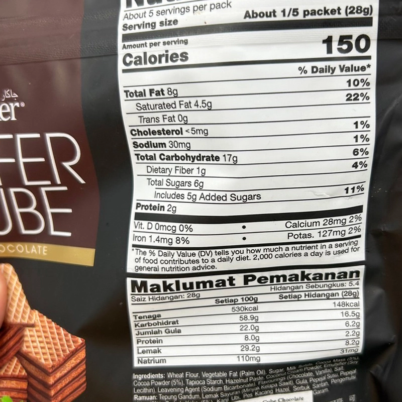 - Bột mì, dầu thực vật (dầu cọ), đường, sữa bột (8%), cacao mass (5%), bột cacao 5%, tinh bột khoai mì, xốt Hazelnut, bột kem dừa, chất nhũ hóa (INS 322(i)), chất tạo xốp (INS 500(ii)), hương liệu tổng hợp (socola, vani) (0.4%), muối.
