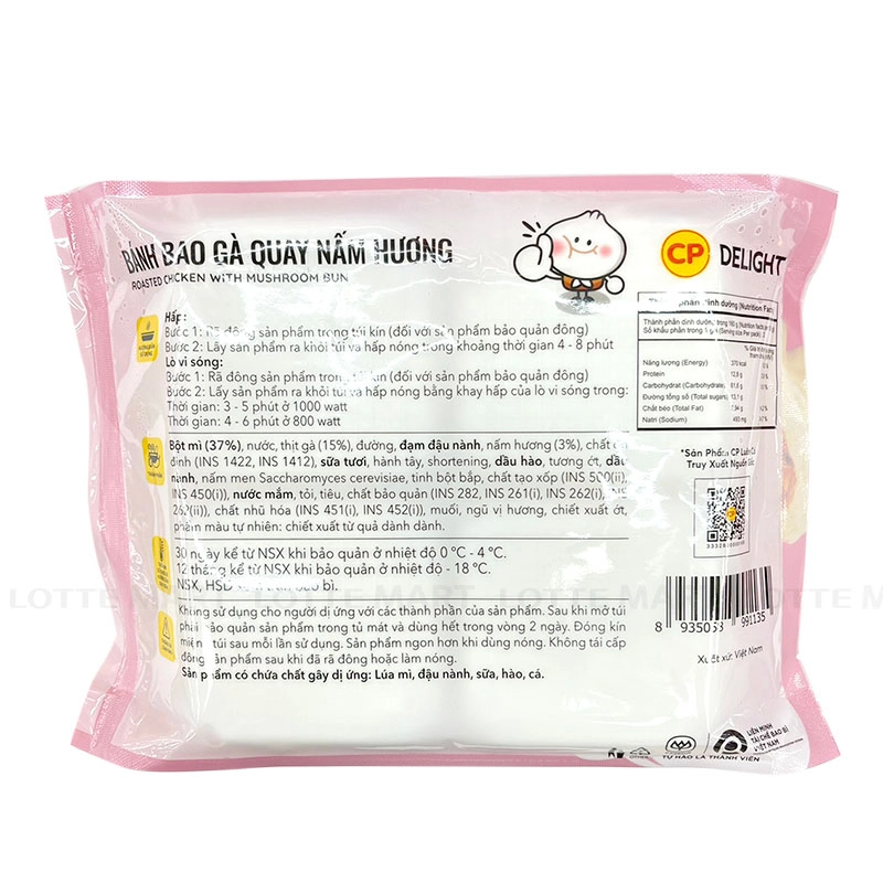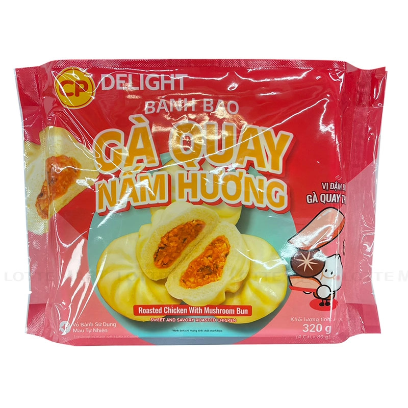 - Bánh Bao CP Delight Gà Quay Nấm Hương là sản phẩm tiện lợi, phù hợp cho những bữa ăn nhanh trong ngày. Bánh có lớp vỏ mềm, xốp nhẹ, bao bọc phần nhân đậm vị từ thịt gà kết hợp cùng nấm hương, tạo nên hương vị hài hòa giữa vị ngọt tự nhiên và độ thơm đặc trưng.