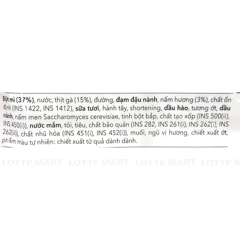 - Bột mì (37%), nước, thịt gà (15%), đường, đạm đậu nành, nấm hương (3%), chất ổn định (INS 1422, INS 1412), sữa tươi, hành tây, shortening, dầu hào, tương ớt, dầu nành, nấm men Saccharomyces cerevisiae, tinh bột bắp, chất tạo xốp (INS 500(ii), INS 450(i)), nước mắm, tỏi, tiêu, chất bảo quản (INS 282, INS 261(i), INS 262(i)), chất nhũ hóa (INS 451(i), INS 452(i)), muối, ngũ vị hương, chiết xuất ớt, phẩm màu tự nhiên: chiết xuất từ quả dành dành.