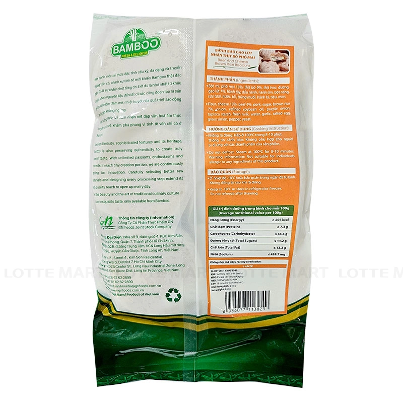 - Bánh Bao Gạo Lứt Nhân Thịt Bò Phô Mai Bamboo là sự kết hợp hoàn hảo giữa vỏ bánh làm từ bột gạo lứt giàu chất xơ và nhân thịt bò xay nhuyễn kết hợp với phô mai mozzarella béo ngậy, mang đến hương vị thơm ngon và bổ dưỡng.