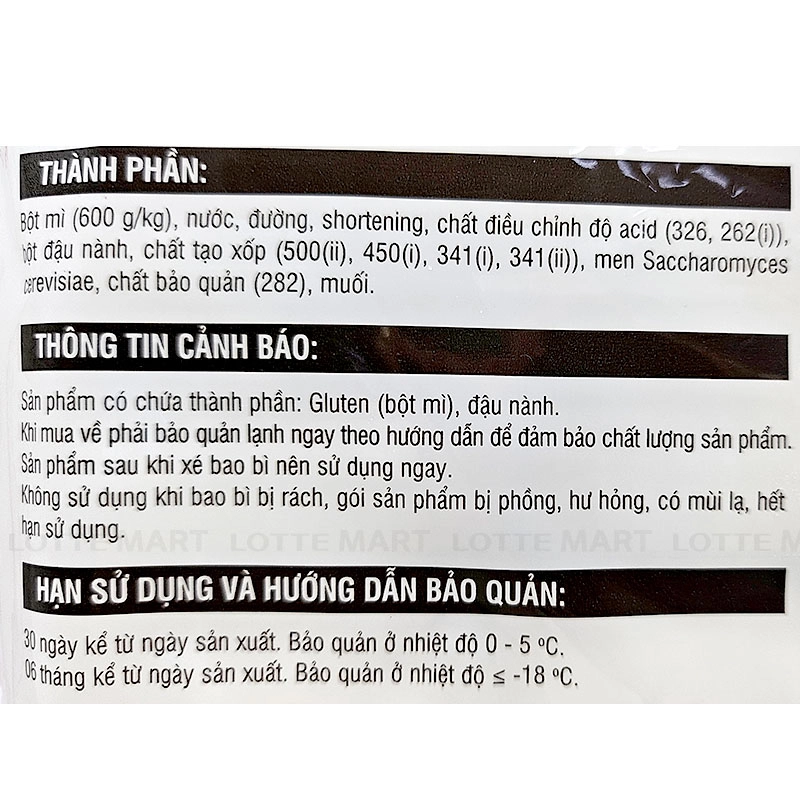 Thành phần: Bột mì (500g/kg), nước, đường, shortening, bột đậu nành, nấm men, phụ gia thực phẩm theo quy định hiện hành, bột nổi, chất bảo quản