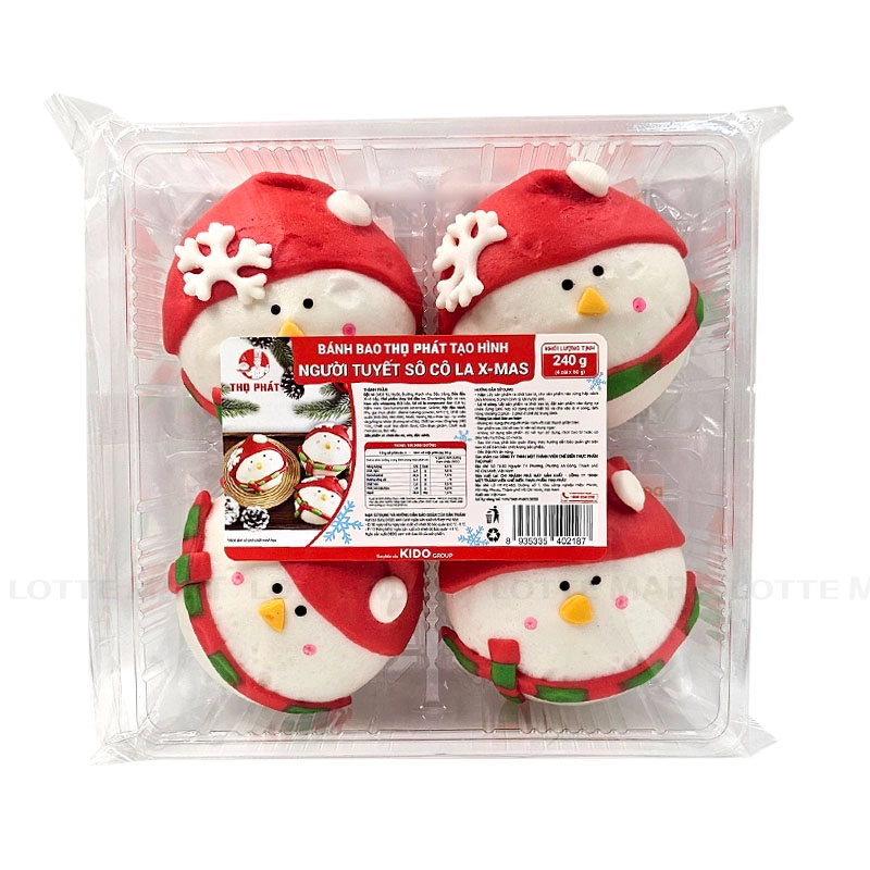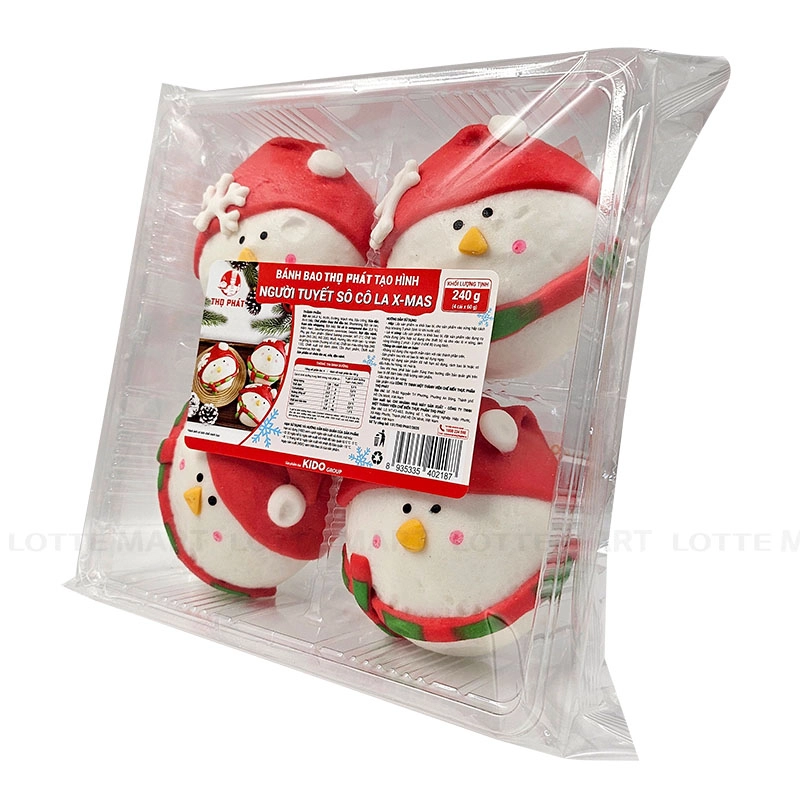 - Bánh Bao Tạo Hình Người Tuyết Nhân Socola Thọ Phát có thiết kế ngộ nghĩnh, đáng yêu với hình dáng người tuyết sinh động, đội chiếc mũ và quàng khăn đỏ bắt mắt, mang đến trải nghiệm thú vị cho người dùng, đặc biệt là trẻ em.
