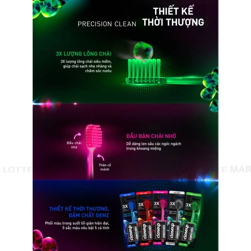 - Bàn Chải Đánh Răng Closeup Precision Clean Lông Chải Mềm Mại với 5 màu sắc nổi bật cùng thiết kế trong suốt, đơn sắc và dáng thân độc đáo, khẳng định chất riêng cá tính và mang lại hàm răng trắng sáng, chắc khỏe.
