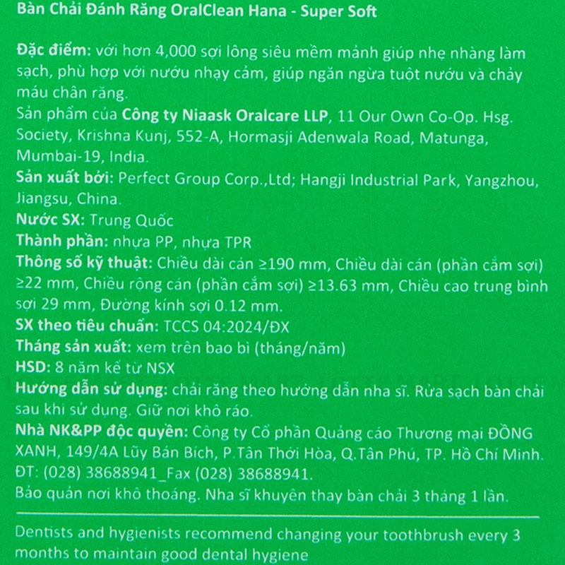 Lưu ý: Thay bàn chải 3 tháng/lần hoặc khi bàn chải bị tòe lông. Chải răng theo hướng dẫn của nha sĩ.
