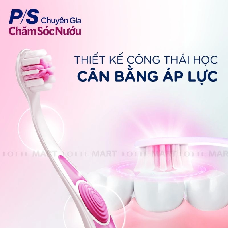 Bàn Chải P/S Chuyên Gia Chăm Sóc Nướu Và Sạch Êm Dịu Nướu với sự kết hợp giữa tay cầm công thái học, cổ cong 3 ngấn và lõi đệm trung tâm giúp giảm đến 4 lần áp lực lên răng và nướu, bảo vệ các vùng nhạy cảm.