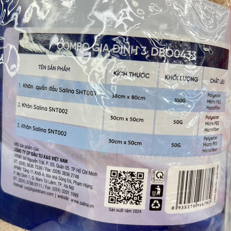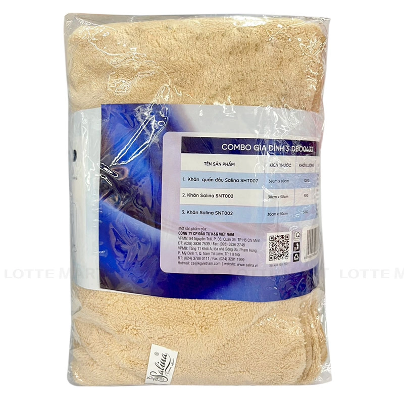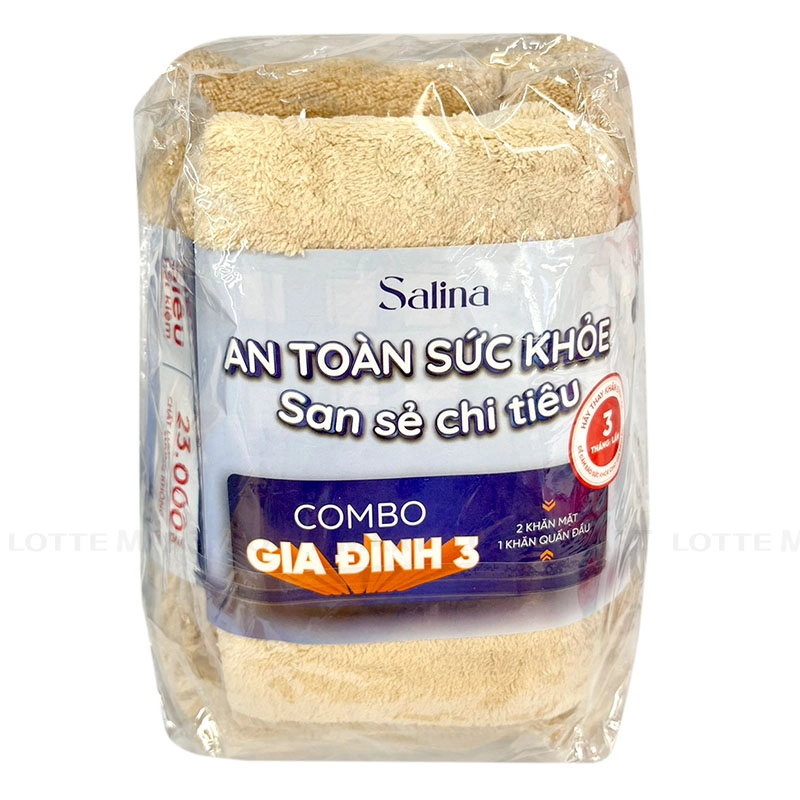 Khăn Gia Đình Salina gồm 3 sản phẩm thiết yếu cho sinh hoạt gia đình là 2 khăn mặt và 1 khăn quấn đầu, đáp ứng nhu cầu chăm sóc cá nhân hàng ngày.