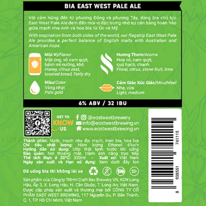 - Với nồng độ cồn vừa phải, East West Pale Ale mở ra bằng hương thơm nhẹ nhàng của cam quýt và hoa cỏ, hoà quyện cùng vị malt dịu ngọt. Khi thưởng thức, vị bia cân bằng giữa sự tươi mát và chiều sâu, để lại hậu vị gọn gàng, êm mượt - khiến mỗi ngụm đều dễ chịu và đầy lôi cuốn.