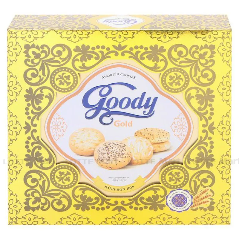 Bánh Hỗn Hợp Goody Gold Bibica (450g) sở hữu thiết kế hộp thiếc được dập nổi hoa văn sang trọng, tinh tế kết hợp màu vàng ấm áp, hạnh phúc báo hiệu một năm mới sum vầy, ấm áp. Bánh quy mang đến hương vị thơm ngon, độ ngọt, béo vừa phải không quá ngấy hoà quyện cùng vị thơm của bơ và sữa, có vị giòn tan của những hạt sôcôla, hạt điều và vị mới lạ của bánh quy trà xanh. Những chiếc bánh quy được làm từ những nguyên liệu chọn lọc như: bột mì, đường, chất béo, mạch nha... cung cấp nhiều chất dinh dưỡng thiết yếu cho cơ thể giúp bạn tràn đầy năng lượng cho ngày làm việc hiệu quả. Bên cạnh đó, sản phẩm được sản xuất theo dây chuyền công nghệ hiện đại và quy trình kiểm tra nghiêm ngặt không chứa hóa chất, chất bảo quản độc hại, đảm bảo sức khỏe cho người tiêu dùng.
