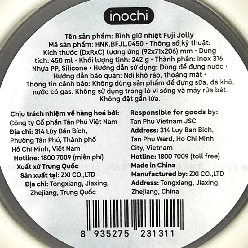 Bình Giữ Nhiệt Inochi Fuji Jolly gồm cấu tạo 4 lớp với lõi Inox 316 chống gỉ và vỏ sơn tĩnh điện, giúp giữ nhiệt tốt.