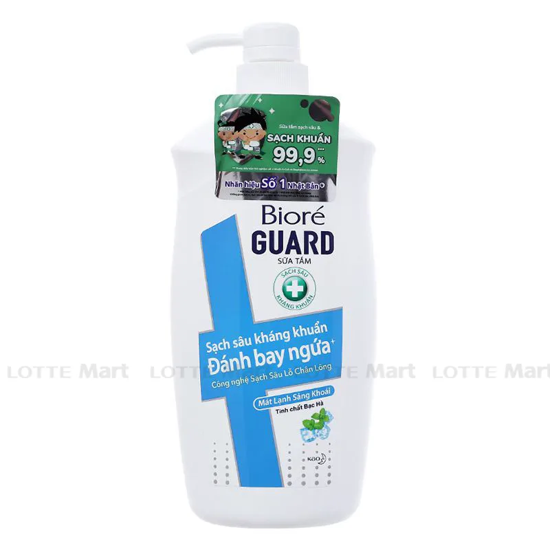 Sữa tắm Bioré Guard Kháng Khuẩn Mát Lạnh Sảng Khoái Chai 800g với hoạt chất kháng khuẩn o-Cymen-5-ol giúp làm sạch da, vi khuẩn và mồ hôi trên da, hỗ trợ ngăn ngừa mụn và rôm sẩy hiệu quả. Sữa tắm có chiết xuất từ bạc hà, tinh dầu xả cùng công thức chăm sóc da chuyên biệt cho làn da ẩm mịn, cho cảm giác sảng khoái và mát lạnh.