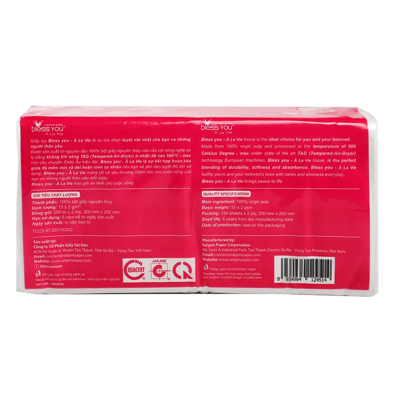 - Khăn Giấy Lụa Bless You À La Vie Cao Cấp 2 Lớp được sản xuất từ 100% bột giấy nguyên sinh cao cấp, với công nghệ xử lí bằng không khí nóng TAD ở nhiệt độ cao 500 độ C, trên dây chuyền sản xuất của châu Âu hiện đại.