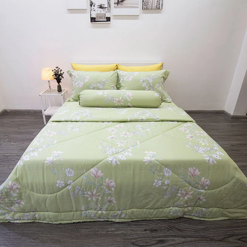 - Bộ drap 5 chi tiết gồm: 1 drap bọc kích thước 1.6x2m; Hai vỏ gối kích thước 50x70cm; Một vỏ gối ôm kích thước 35x100cm; Một chăn kích thước 200x220cm.