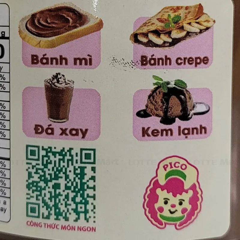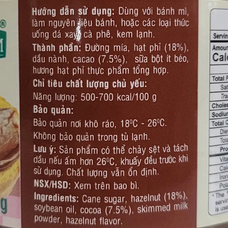 Thành phần: Đường mía RE, hạt phỉ (15-20%), dầu hướng dương, dầu nành, cacao, sữa bột, hương hạt phỉ tổng hợp.