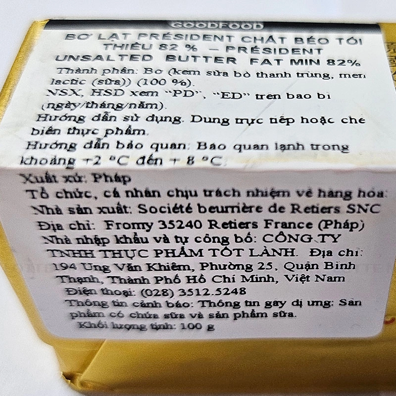 Thành phần: Bơ (kem sữa bò thanh trùng, men lactic (sữa)) (100%).