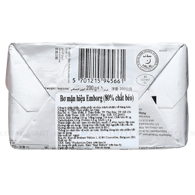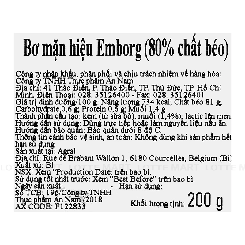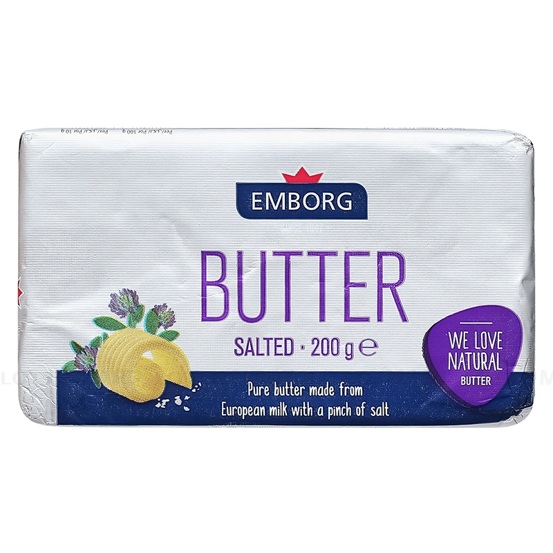 - Bơ Mặn Emborg 200G có nhiều chất dinh dưỡng cần thiết cho cơ thể. Sản phẩm cung cấp protein để bồi đắp cơ, hỗ trợ các bộ phận hoạt động và tăng cường canxi cho xương chắc khỏe. Sản phẩm đến từ Đan Mạch. Bơ được sản xuất theo công thức đặc biệt mang lại hương vị đặc trưng thơm ngậy của sản phẩm chế biến từ sữa. Bơ rất dễ ăn, phù hợp với mọi lứa tuổi.