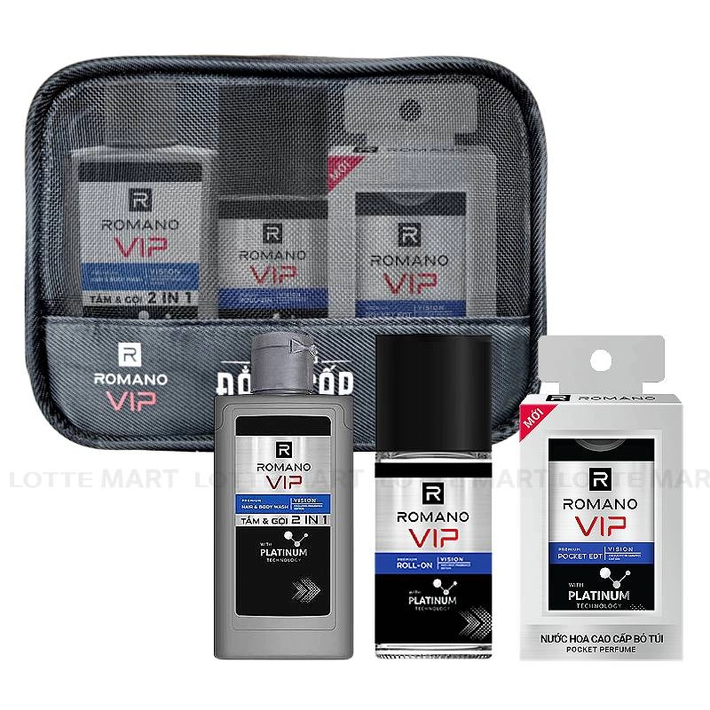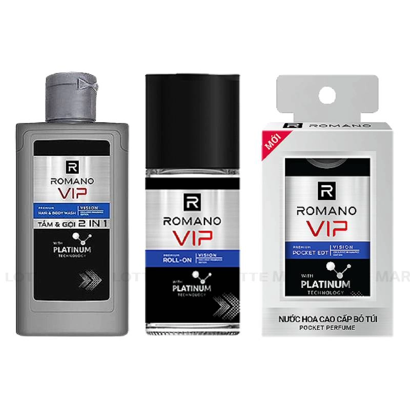 - Bộ sản phẩm bao gồm 1 tắm gội Romano VIP Vision, 1 lăn khử mùi Romano VIP Vision và 1 nước hoa bỏ túi Romano VIP Vision.