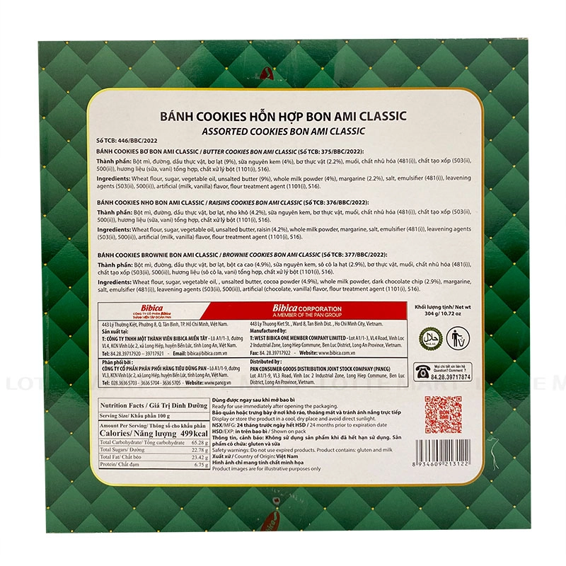 Bánh Quy Bon Ami Classic Hỗn Hợp 304G nhiều loại bánh quy giòn tan thơm ngon cho bạn lựa chọn. Hương bánh quy thơm mùi sữa hòa quyện với nhiều dạng bánh quy bơ, bánh quy cacao brownie, bánh quy nho cho bạn nhiều trải nghiệm, bánh quy vị ngọt vừa phải, không quá ngấy và phù hợp với khẩu vị của đa số mọi người. Đặc điểm nổi bật: hộp bánh được thiết kế tinh tế, có thể dùng với nhiều mục đích như tặng quà, cúng lễ, sum họp gia đình,...Hộp bánh gồm nhiều loại bánh: bánh quy bơ thơm béo, bánh quy brownie giòn tan thoảng vị đăng đắng của cacao, bánh quy nho là sự kết hợp giữa bánh quy béo ngậy cùng nho khô thơm lừng tạo nên hương vị bánh gây thương nhớ. Thành phần: Bột mì, đường, chất béo thực vật (dầu olein tinh luyện), 11% bơ lạt, sữa bột, muối, chất tạo xốp (E500(ii), E503(ii)), hương tổng hợp (sữa, vani). Hướng dẫn sử dụng: Ăn trực tiếp hoặc dùng kèm với trà và sữa tươi. Quy cách sản phẩm: Hộp 48 gói. Hướng dẫn bảo quản: bảo quản nơi khô ráo, thoáng mát, tránh ánh nắng trực tiếp. Xuất xứ: Việt Nam.