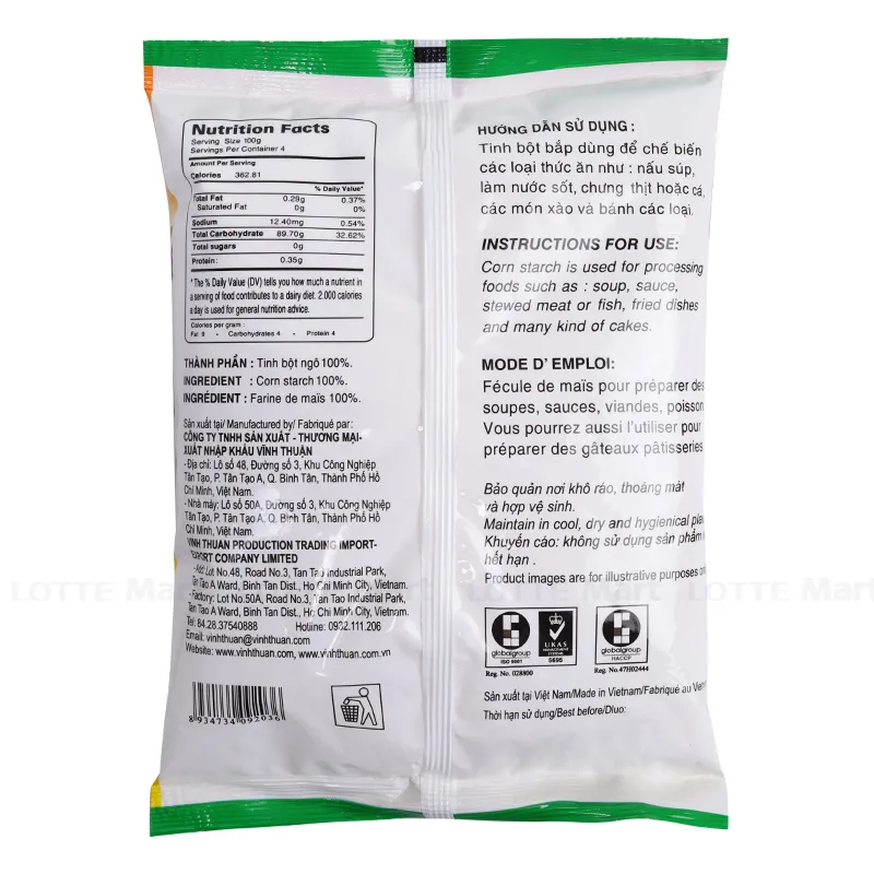 Bột không chứa các chất phụ gia gây hại, đem đến sự an toàn cho người sử dụng. Bột sau khi chế biến thành món ăn sẽ trở nên thơm ngọt mang hương vị tự nhiên của bắp non. Thành phần: Tinh bột ngô. Công dụng: dùng để chế biến trong món súp, món xào, món chiên. Bảo quản ở nơi khô thoáng, tránh ánh nắng trực tiếp.