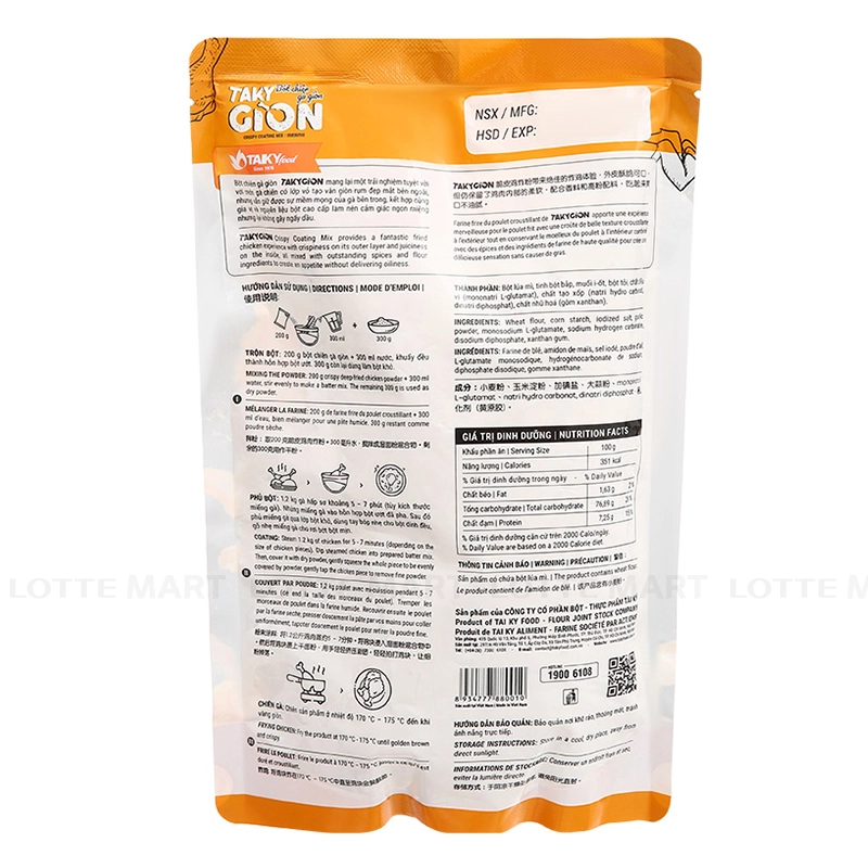 - Được đóng gói tiện lợi, Bột Chiên Gà Giòn Tài Ký dễ dàng sử dụng cho nhiều bữa tiệc hay dịp đặc biệt. Bạn có thể thoải mái chế biến gà chiên cho các bữa ăn hàng ngày hoặc các buổi tụ tập, tiệc tùng. Hãy để Bột Chiên Gà Giòn Tài Ký đồng hành cùng bạn trong việc tạo ra những món ăn hấp dẫn, ngon miệng và ấn tượng cho gia đình và những người thân yêu.