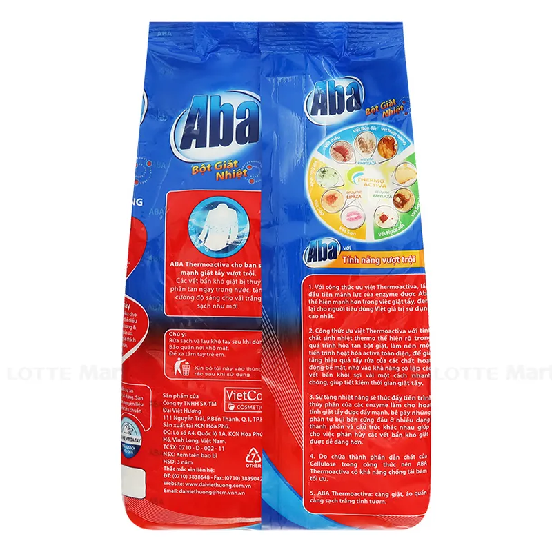 - Bột Giặt Nhiệt Aba Sạch Tinh Tươm Túi 770g với công thức Thermoactiva ưu việt, xóa sạch các vết bẩn khỏi sợi vải nhanh chóng và với thành phần dẫn chất cellulose giữ màu quần áo như mới.