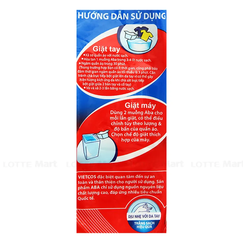 - Hướng dẫn sử dụng: - Giặt máy: Dùng 2 muỗng bột giặt nhiệt Aba cho mỗi lần giặt, điều chỉnh theo số lượng và độ bẩn của quần áo. - Giặt tay:Hòa tan một muỗng bột giặt nhiệt Aba trong 3-4 lít nước. Ngâm quần áo trong 30 phút để đạt hiệu quả cao nhất. Xả nước 2-3 lần sau khi giặt.