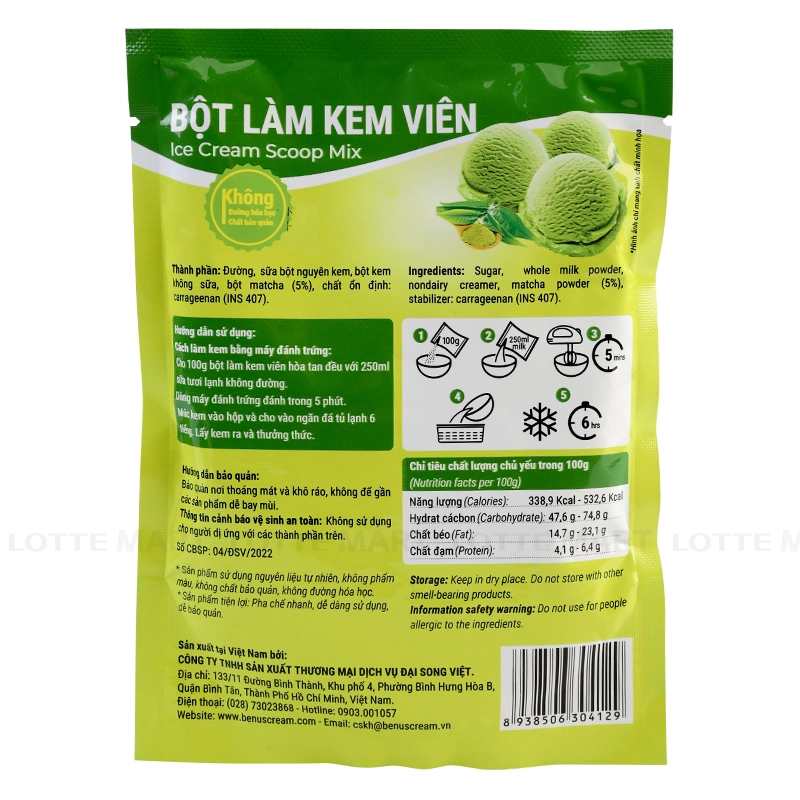 - Bột Làm Kem Viên Benuscream Matcha Gói 100G mang hương vị và màu sắc tự nhiên. Ngọt thanh dịu và đặc biệt kem béo thơm, màu sắc bắt mắt, không gây cảm giác béo ngậy gây ngán khi ăn. Đây là ưu điểm đặc biệt khiến cho mọi khách hàng hài lòng luôn và nhớ đến hương vị khi thưởng thức kem matcha được làm từ bột làm kem gia đình Benuscream.