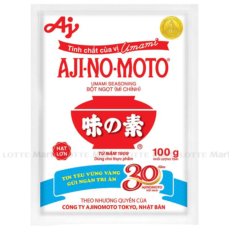 Bột Ngọt Ajinomoto 100G Được sản xuất bằng phương pháp lên men tự nhiên từ mật mía đường và tinh bột khoai mỳ. Sau quá trình lên men, một loại axit amin tên là glutamic được tạo ra. Từ axit glutamic, một gia vị độc đáo dùng để tăng gia vị tự nhiên của thực phẩm được sản xuất ra. Thành phần: Mật mía đường, tinh bột và khoai mì. Hướng dẫn sử dụng: Dùng để nêm các loại món ăn như canh, lẩu, chiên, xào. Hướng dẫn bảo quản: Bảo quản sản phẩm ở nơi khô ráo, thoáng mát tránh ẩm mốc.