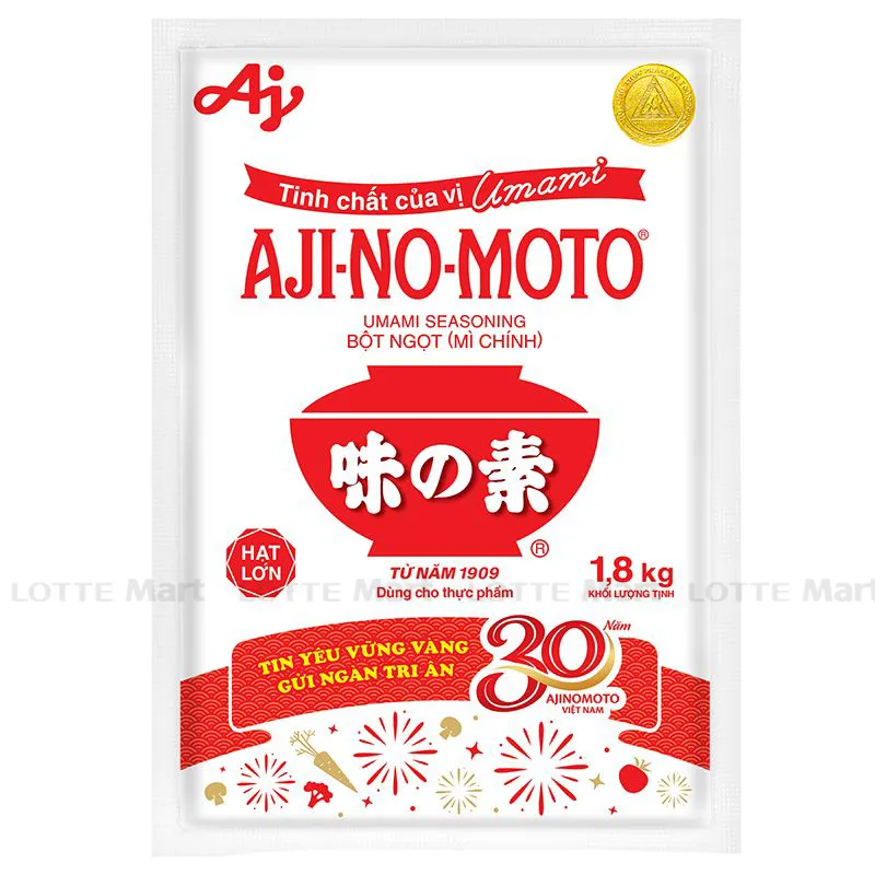 Bột Ngọt Ajinomoto Gói 1.8kg Được sản xuất bằng phương pháp lên men tự nhiên từ mật mía đường và tinh bột khoai mỳ. Sau quá trình lên men, một loại axit amin tên là glutamic được tạo ra. Từ axit glutamic, một gia vị độc đáo dùng để tăng gia vị tự nhiên của thực phẩm được sản xuất ra. Đó chính là bột ngọt là một gia vị thực phẩm có chức năng điều vị, được sử dụng rộng rãi trong chế biến món ăn ở gia đình, nhà hàng và trong công nghiệp chế biến thực phẩm, làm cho thực phẩm ngon và hấp dẫn hơn. Thành phần: Mật mía đường, tinh bột và khoai mì. Hướng dẫn sử dụng: Dùng để nêm các loại món ăn như canh, lẩu, chiên, xào. Hướng dẫn bảo quản: Để nơi khô ráo, thoáng mát, tránh ánh nắng mặt trời.