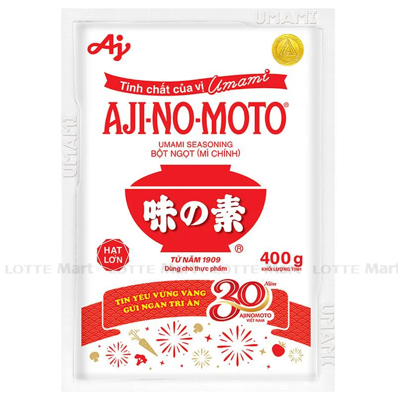 Bột Ngọt Ajinomoto được sản xuất bằng phương pháp lên men tự nhiên từ nguồn nguyên liệu thiên nhiên như mật mía đường và tinh bột khoai mì. Với kinh nghiệm từ năm 1909 đến nay, Bột ngọt AJI-NO-MOTO với hàm lượng glutamate tinh khiết hơn 99% mang đến vị ngon đậm đà cho thực phẩm. Bột ngọt AJI-NO-MOTO là một gia vị thực phẩm có chức năng điều vị làm cho thực phẩm ngon hơn, được sử dụng rộng rãi trong chế biến món ăn ở gia đình, nhà hàng và trong công nghiệp chế biến thực phẩm. Sản phẩm đến từ thương hiệu Ajinomoto nổi tiếng, được sản xuất trên dây chuyền công nghệ hiện đại với những nguyên liệu tự nhiên là mật mía đường và tinh bột khoai mì. Mang đến một loại gia vị tốt cho sức khỏe và đảm bảo tuyệt đối vệ sinh an toàn thực phẩm.