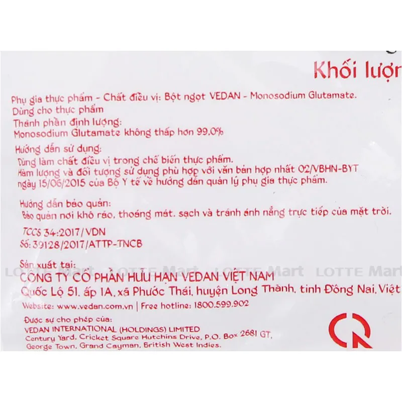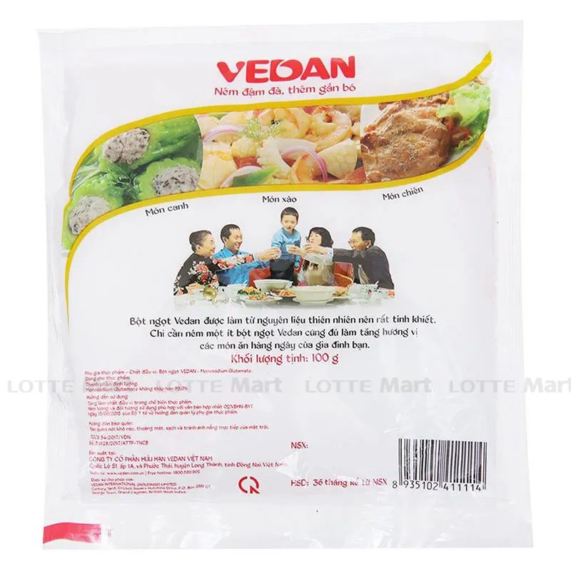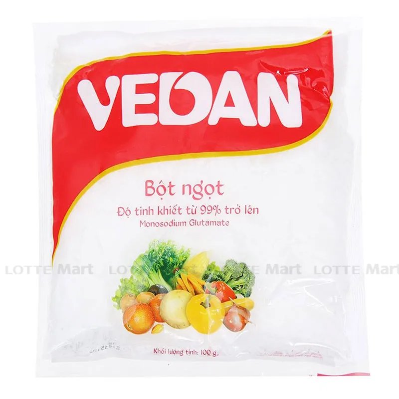 Bột Ngọt Vedan 100G giúp giữ nguyên hương vị món ăn được sản xuất bằng phương pháp lên men tự nhiên từ mật mía đường và tinh bột khoai mỳ. Sau quá trình lên men, một loại axit amin tên là glutamic được tạo ra. Từ axit glutamic, một gia vị độc đáo dùng để tăng gia vị tự nhiên của thực phẩm được sản xuất ra. Thành phần: Mật mía đường, tinh bột khoai mì. Hướng dẫn sử dụng: Dùng để nêm các loại món ăn như canh, lẩu, chiên, xào. Hướng dẫn bảo quản: Để nơi khô ráo, thoáng mát, tránh ánh nắng mặt trời.
