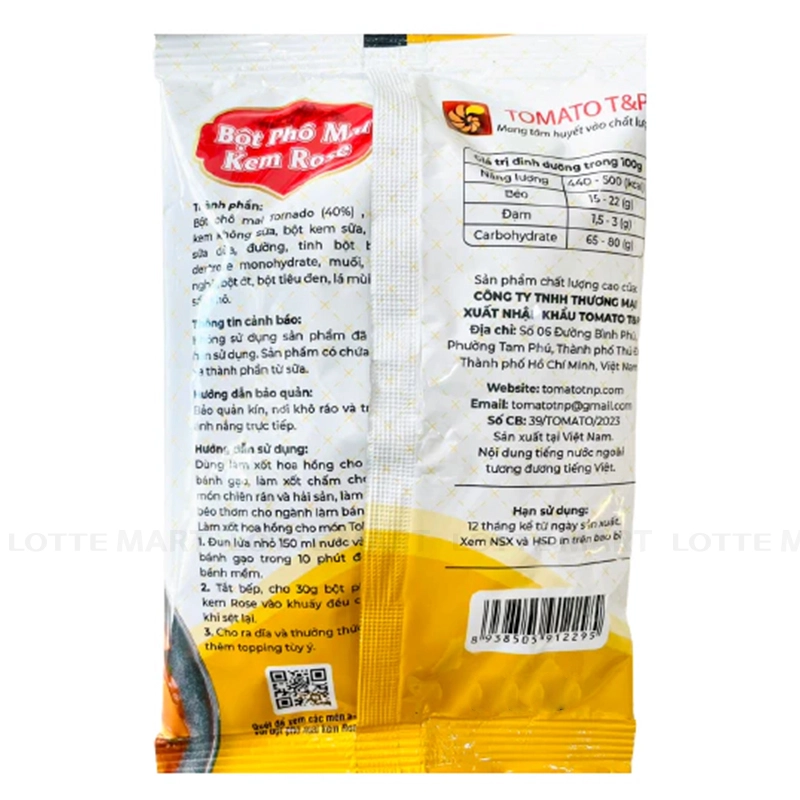 - Bột Phô Mai Kem Rose Tomato T&P là sản phẩm tinh tế mang đến hương vị đậm đà và thơm ngon, được chế biến từ sự kết hợp hoàn hảo giữa phô mai, kem, sữa cùng các gia vị như nghệ, tiêu và lá mùi tây.