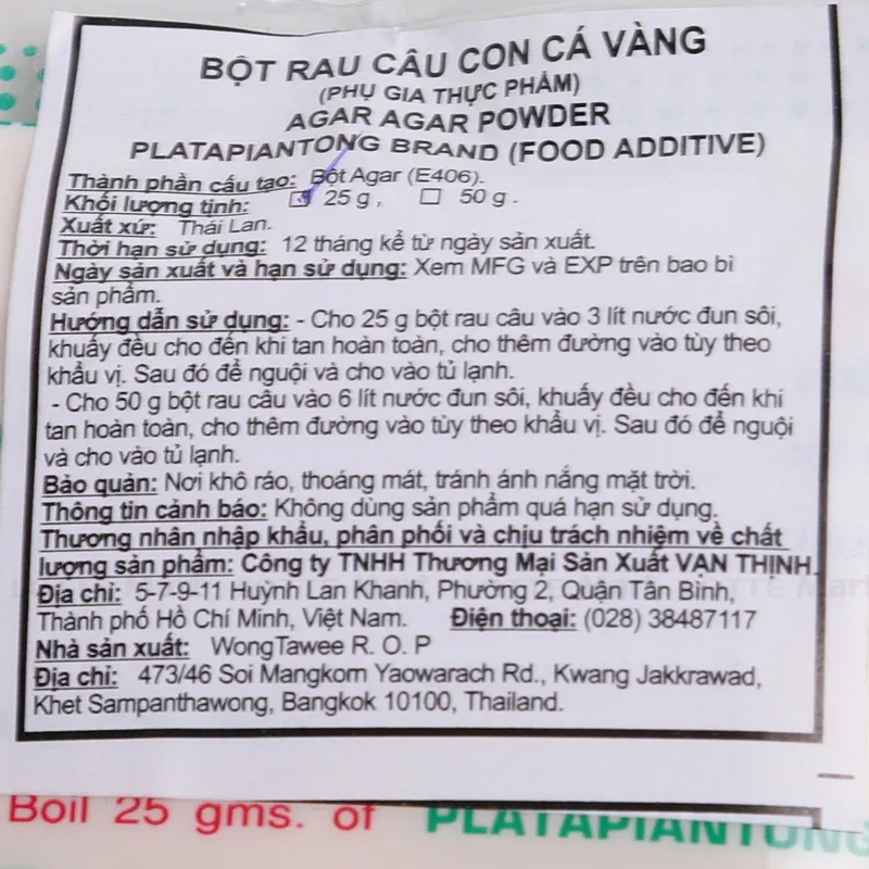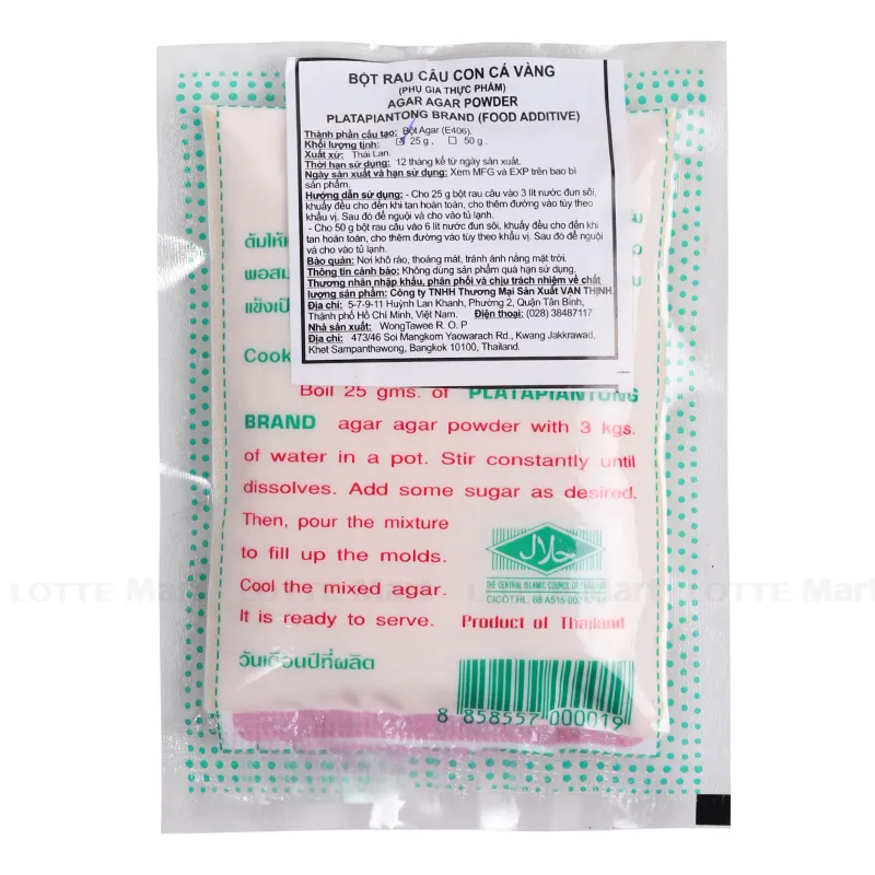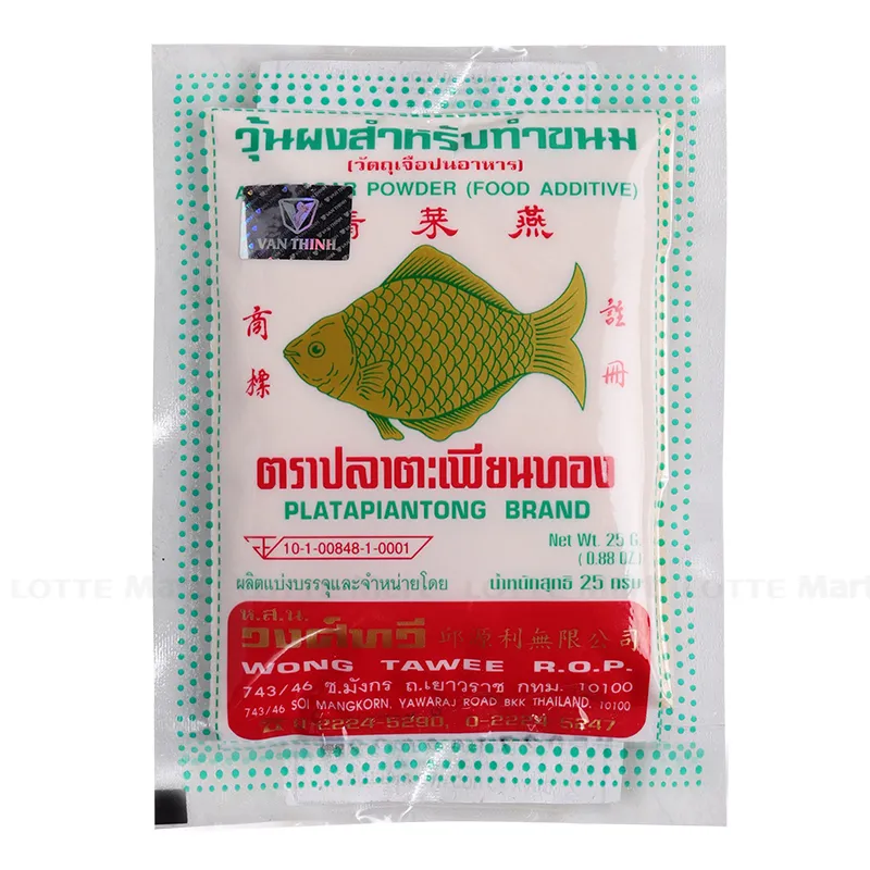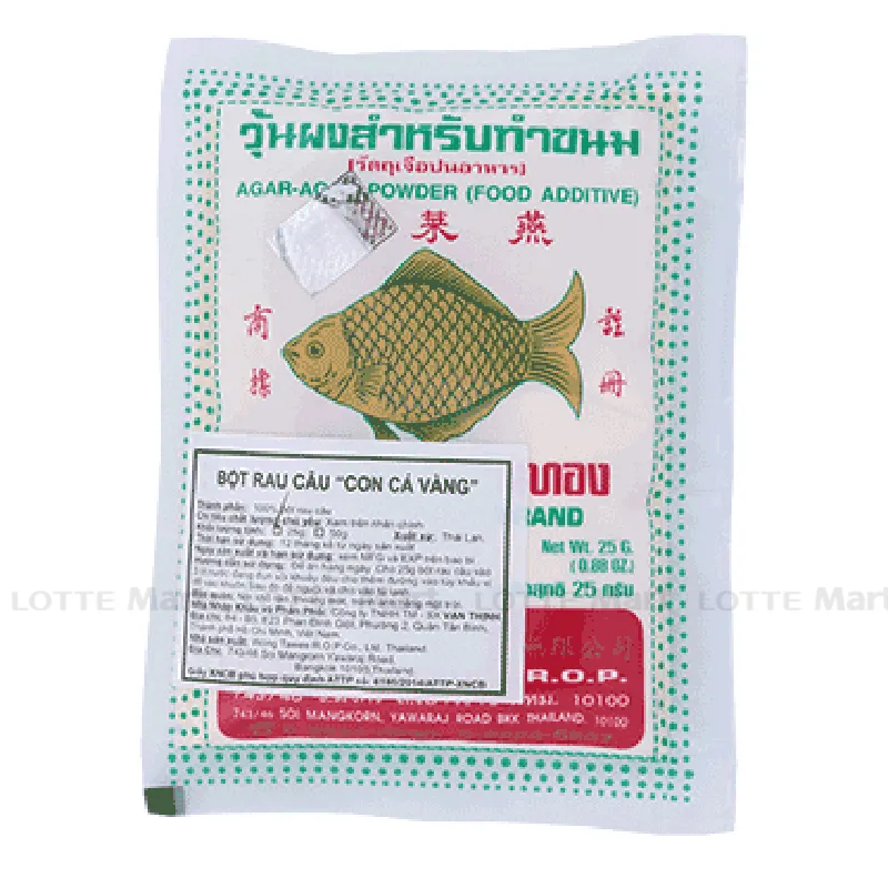 Bột Rau Câu Con Cá Vàng Platapiantong Gói 25G sau khi được chế biến có độ mềm vừa phải, kết hợp với các nguyên liệu khác tạo nên hương vị thơm ngon, bổ dưỡng. Thành phần: 100% bột rau câu. Công dụng: Dùng để chế biến thạch rau câu. Bảo quản ở nơi khô thoáng, tránh ánh nắng trực tiếp.
