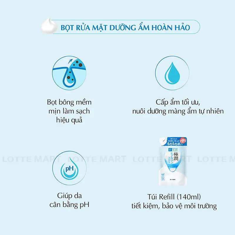 Bọt rửa mặt dưỡng ẩm Hada Labo Gokujyun Foaming Wash với dạng bọt mềm mịn giúp lấy đi bụi bẩn, bã nhờn ẩn sâu trong lỗ chân lông nhưng vẫn nhẹ dịu với làn da. Sự kết hợp hoàn hảo giữa HA và SHA giúp cung cấp độ ẩm để nuôi dưỡng màng ẩm tự nhiên và ngăn ngừa tình trạng da mất nước khi rửa mặt. Nhờ đó, làn da trở nên mịn màng và ẩm mượt như vừa được đắp mặt nạ.
