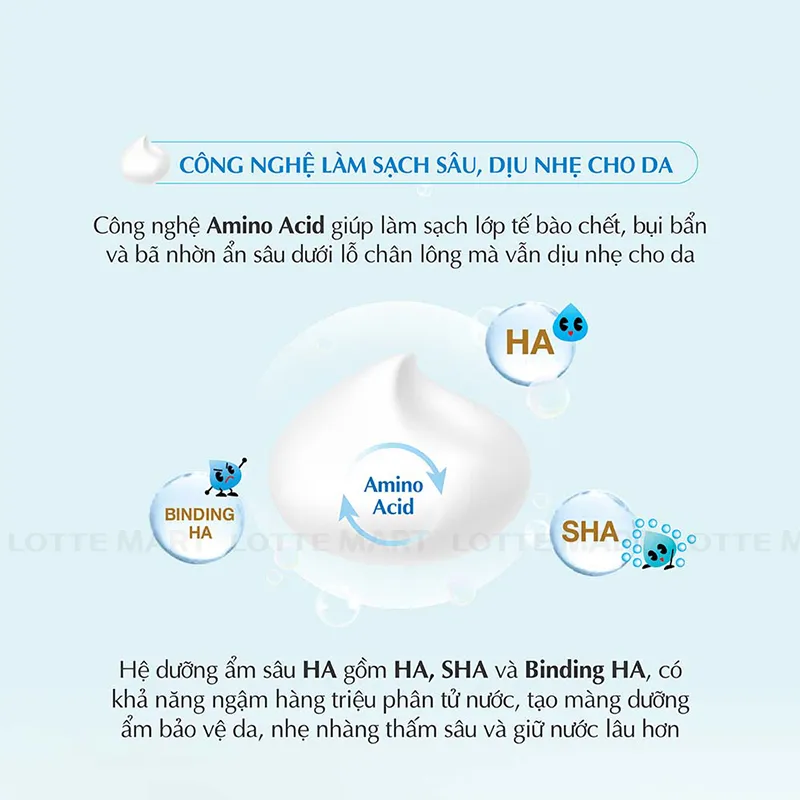 Sự kết hợp hoàn hảo giữa HA và SHA giúp cung cấp độ ẩm để nuôi dưỡng màng ẩm tự nhiên và ngăn ngừa tình trạng da mất nước khi rửa mặt. Nhờ đó, làn da trở nên mịn màng và ẩm mượt như vừa được đắp mặt nạ