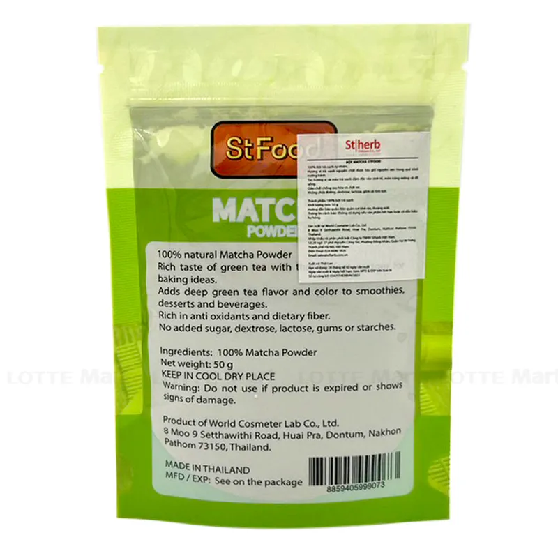 • Bột Trà Xanh ST Food Gói 50G có vị trà mạnh, thanh thanh, hậu ngọt, không chát, ít đắng. Sản phẩm có thành phần từ 100% bột trà xanh nguyên chất giúp bạn lưu trữ trọn vẹn hương vị trà xanh trong quá tình nướng bánh.