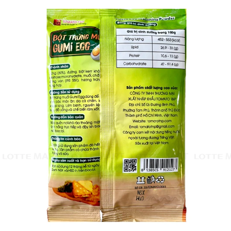 - Với bao bì đóng gói tiện lợi, Bột Trứng Muối Tomato T&P rất dễ dàng sử dụng và bảo quản. Đây là lựa chọn hoàn hảo cho những ai muốn thử nghiệm và sáng tạo trong gian bếp của mình mà vẫn đảm bảo hương vị thơm ngon của món ăn.