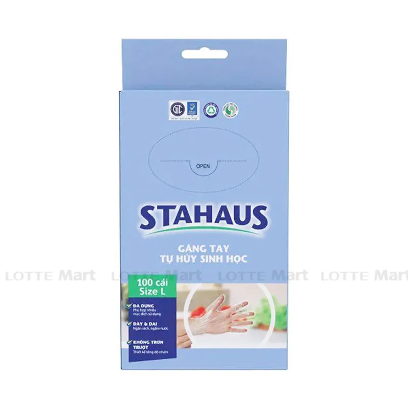 Hộp 100 Găng Tay Tự Hủy Sinh Học Stahaus Size L là găng tay dùng một lần, làm từ chất liệu nhựa PE an toàn, phù hợp sử dụng trong tiếp xúc trực tiếp với thực phẩm như thịt heo, bò, gà, thủy hải sản, rau củ,...