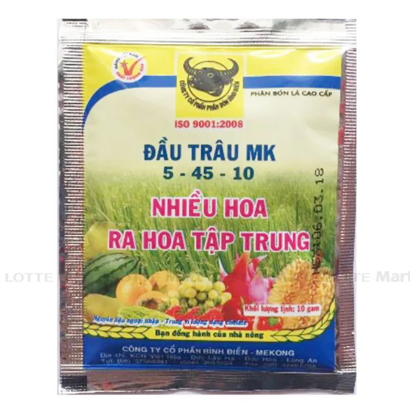 Phân Đầu Trâu Ra Nhiều Hoa 5-45-10 Gói 10G giúp kích thích phân hóa mầm hoa mạnh, ra hoa nhiều tập trung.