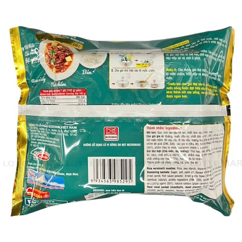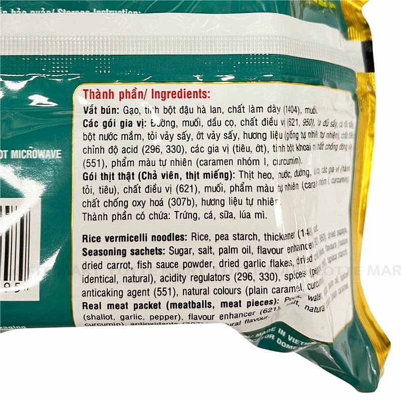 Vắt bún: Gạo, tinh bột đậu hà lan, chất làm dày (1404), muối.