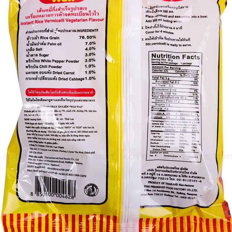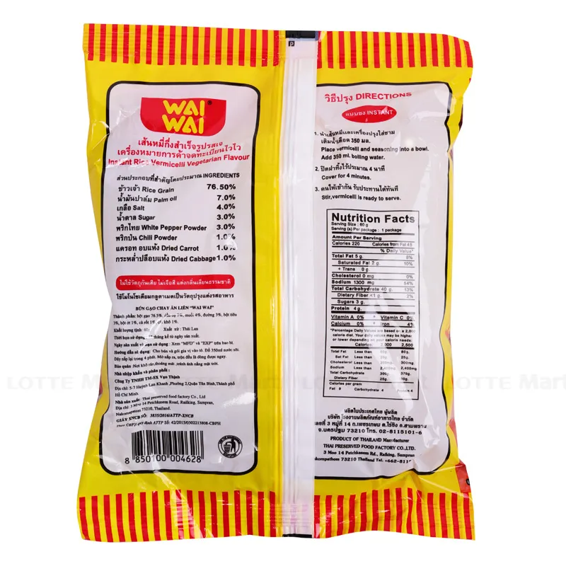 Bún Gạo WAI WAI Chay 60G có thành phần làm từ bột gạo, tinh bột mì, muối và các hương liệu, gia vị cao cấp đã qua quá trình kiểm định độ an toàn cho sức khỏe người dùng. Sợi bún thơm ngon với hương vị của thịt rau củ tự nhiên tươi mới mang lại cho bạn một bữa ăn nhanh thơm ngon, hấp dẫn. Thành phần: Bột gạo 76,5%, dầu cọ 7%, muối 4%, đường 3%, bột tiêu 3%, bột ớt 1%, cải khô 1%. Hướng dẫn sử dụng: Cho bún và các gói gia vị vào tô. Cho nước sôi vào khoảng 400ml, đậy kín nắp trong 3 phút. Trộn đều là có thể dùng được ngay. Hướng dẫn bảo quản: Bảo quản nơi khô ráo, thoáng mát.
