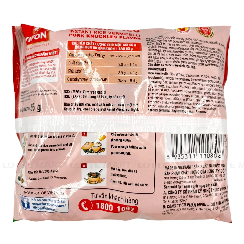 Hướng dẫn sử dụng: Cho vắt bún và các gói gia vị vào tô. Dùng nước thật sôi đổ ngập vắt bún (khoảng 400ml). Đậy kín nắp và chờ trong 3 phút. Mở nắp, cho gói riêu cua vào, trộn đều và dùng ngay. Hướng dẫn bảo quản: Bảo quản nơi khô mát và tránh ánh nắng mặt trời. Sản xuất tại Việt Nam.