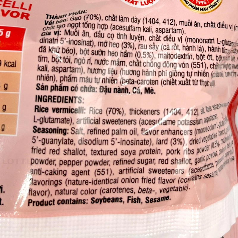 Thành phần: Gạo, chất ổn định, đường, muối ăn, chất điều vị, gia vị, các loại rau củ sấy khô.