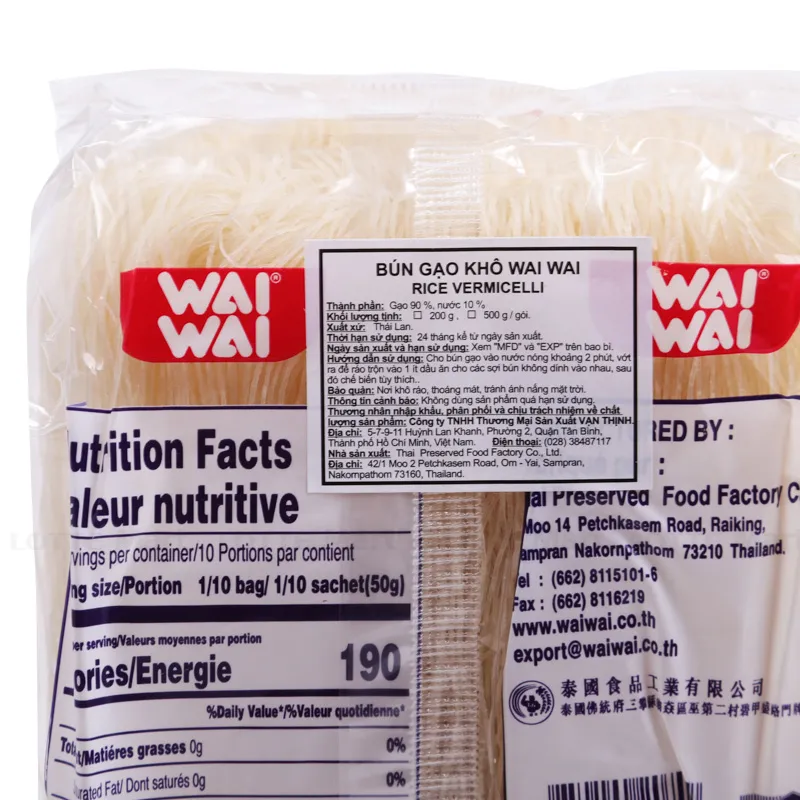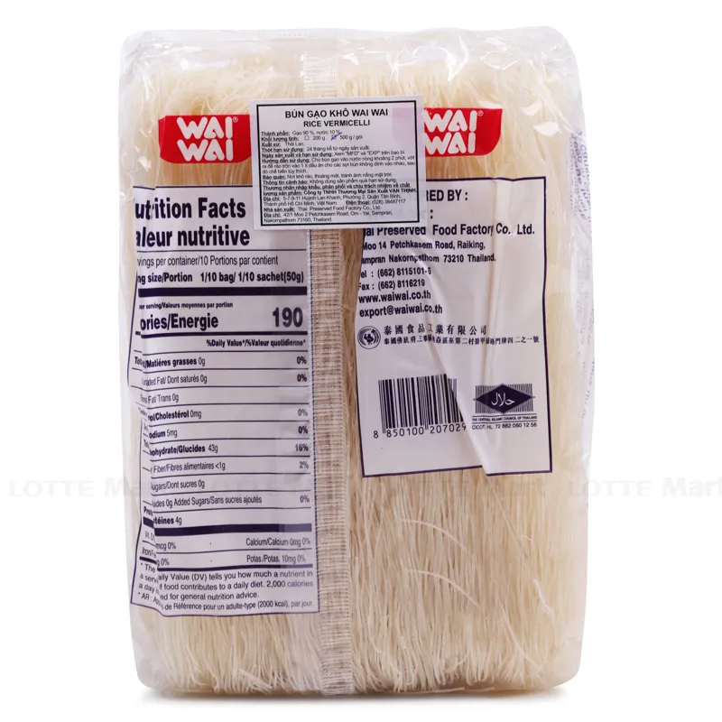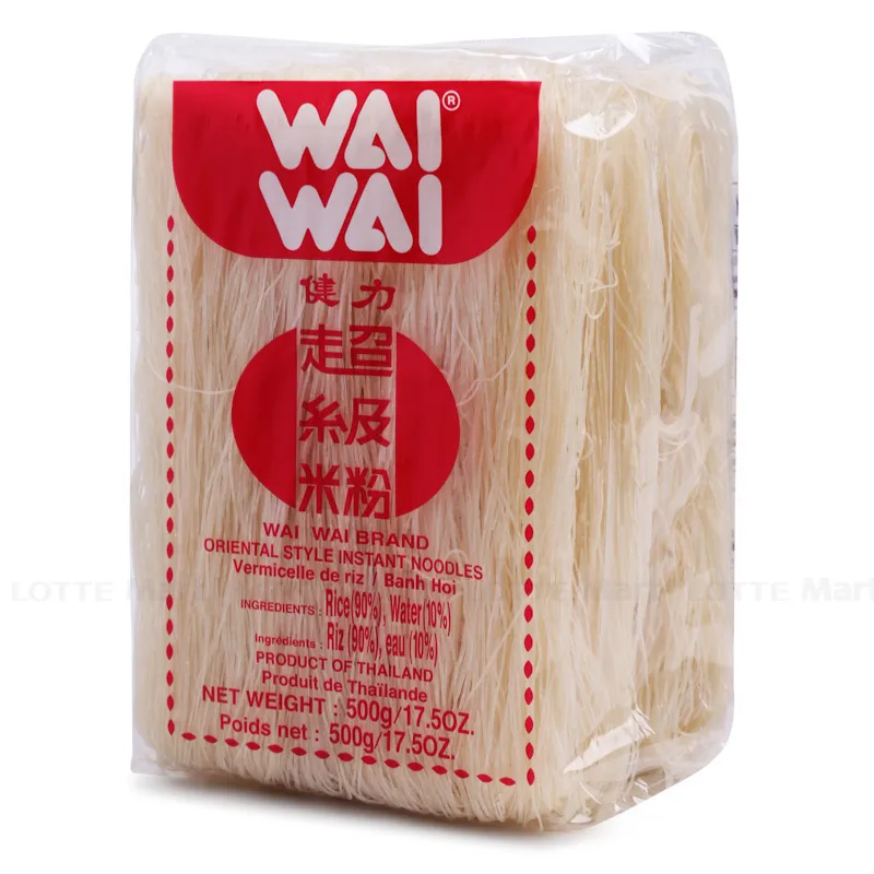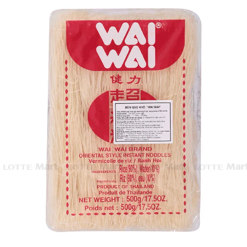 Bún Gạo Khô Wai Wai Gói 500gr: được chế biến từ loại gạo hảo hạng, cho sợi bún trắng mềm, dai ngon. Chỉ mất ít phút làm mềm bún với nước nóng là bạn đã có một nguyên liệu tuyệt hảo cho việc chế biến nhiều món ăn ngon cho cả gia đình. Thành phần: Bột gạo, muối ăn, chất ổn định. Hướng dẫn sử dụng: Bún xào: Ngâm bún trong nước lạnh khoảng 15 - 20 phút, vớt bún ra để ráo nước. Xào thịt trước, tôm, cua và các loại gia vị khác gần chín. Sau đó bỏ bún vào đảo đều cho nóng là dùng được. Bún tươi: Cho bún vào nước đang sôi, dùng đũa khuấy đều, nấu khoảng 4 phút vớt ra xả với nước lạnh để khoảng 5 phút. Sau đó sử dụng như bún tươi: nấu với nước lèo, lẩu, cuốn với bánh tráng...Hướng dẫn bảo quản: Bảo quản nơi khô ráo, mát mẻ.