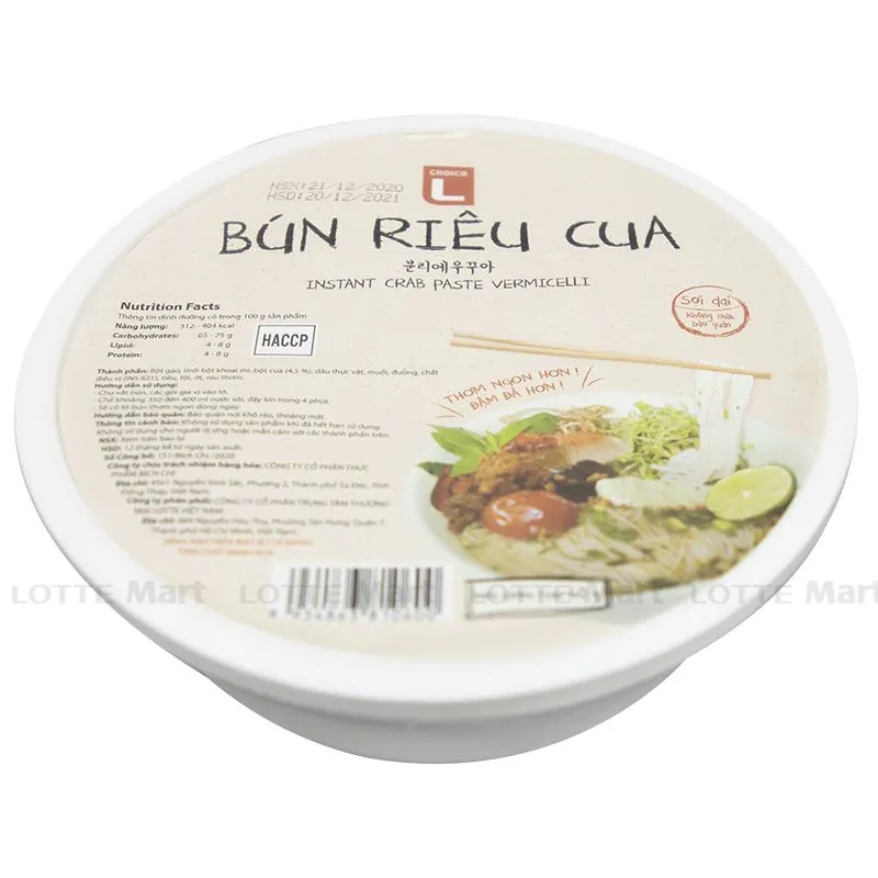 Bún Riêu Cua Choice L (CL) Tô 60G gây ấn tượng hương vị bún riêu cua truyền thống đậm đà của Việt Nam, không cần ra hàng quán bạn vẫn có thể thưởng thức bún riêu đóng gói từ thương hiệu Choice L. Sản phẩm được sản xuất trên dây chuyền công nghệ khép kín, đảm bảo vệ sinh an toàn thực phẩm cho người tiêu dùng. Có thể dùng làm bữa ăn nhanh đầy bổ dưỡng.