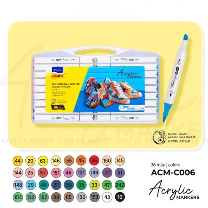 - Bút Lông Màu Acrylic 2 Đầu Colokit ACM-C002 Hộp 36 Màu là bộ bút đa năng với thiết kế 2 đầu tiện dụng: đầu BROAD cho nét đậm, phủ màu nhanh và đầu BRUSH linh hoạt, phù hợp viết vẽ chi tiết.
