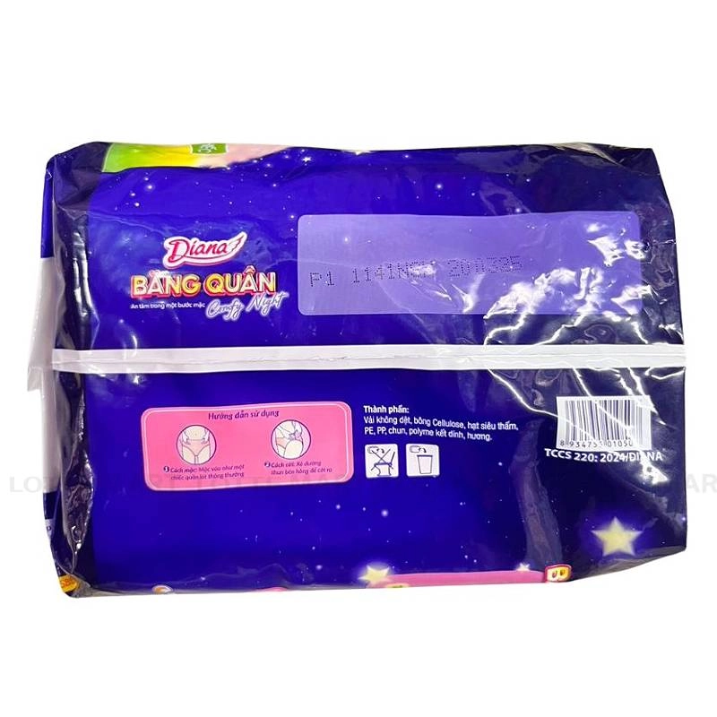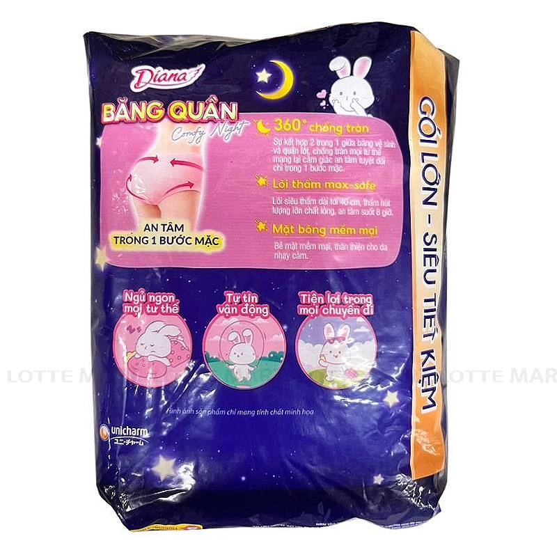 - Băng Vệ Sinh Dạng Quần Diana Comfy Night là sản phẩm chuyên dụng dành cho những ngày đèn đỏ, mang lại cảm giác thoải mái và an toàn suốt đêm. Thiết kế dạng quần giúp ôm sát cơ thể, ngăn ngừa tràn hiệu quả.